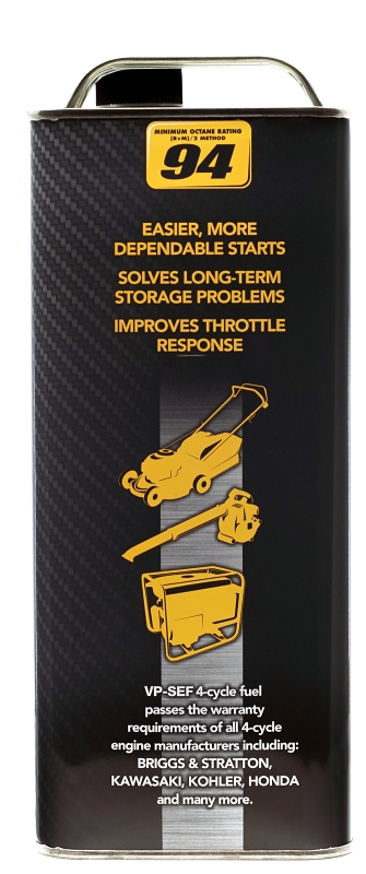 VP four-cycle small engine fuel is 94 octane, ethanol-free and contains no oil. This fuel is designed to burn clean, won't attract moisture, oxidize or form gummy deposits in the carburetor. Meets warranty requirements of all four-cycle engine manufacturers including Briggs & Stratton, Kawasaki, Kohler, Honda and more.Item Specifications