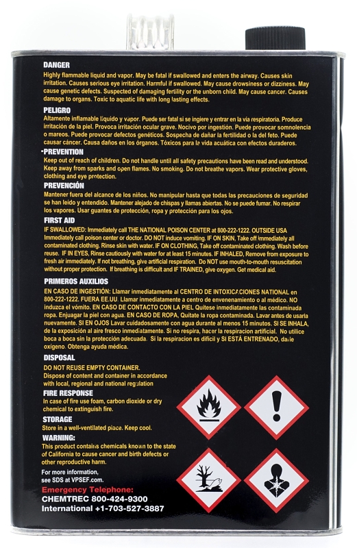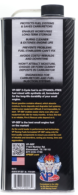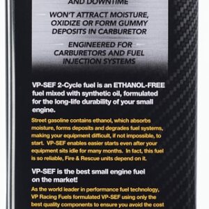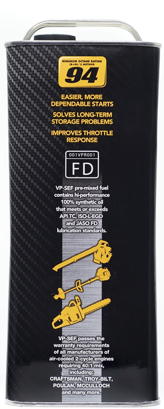 VP SEF two-cycle blends use the highest quality, cleanest burning synthetic oil on the market. It's virtually smoke-free and substantially reduces carbon deposits in engines. VP SEF's lubricant package meets or exceeds JASO FD, ISO-EGD and API TC standards as well as all manufacturers' specs, including STIHL, Husqvarna, ECHO, Maruyama, Shindaiwa and more.Item Specifications