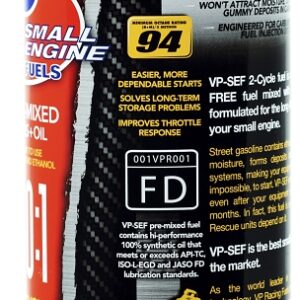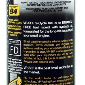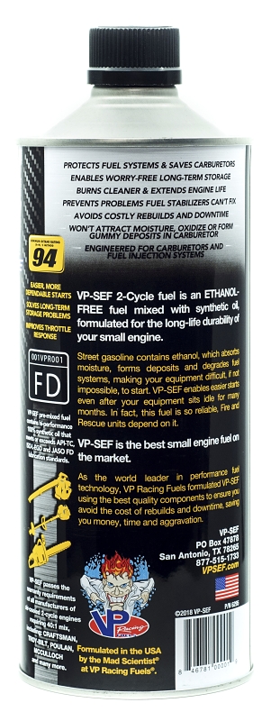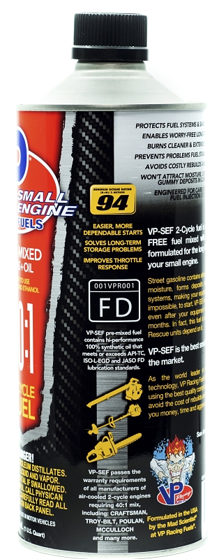 VP SEF two-cycle blends use the highest quality, cleanest burning synthetic oil on the market. It's virtually smoke-free and substantially reduces carbon deposits in engines. VP SEF's lubricant package meets or exceeds JASO FD, ISO-EGD and API TC standards as well as all manufacturers' specs, including STIHL, Husqvarna, ECHO, Maruyama, Shindaiwa and more.
