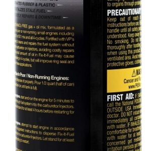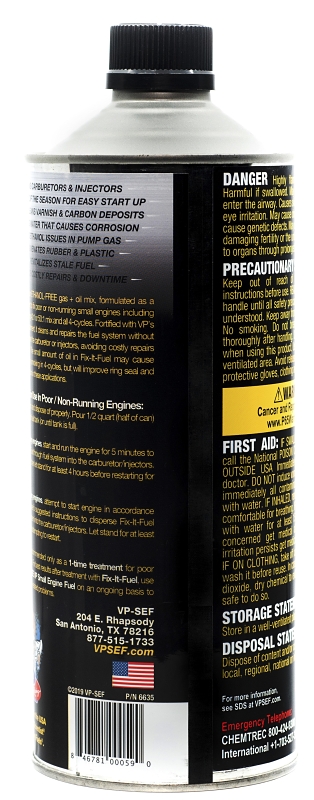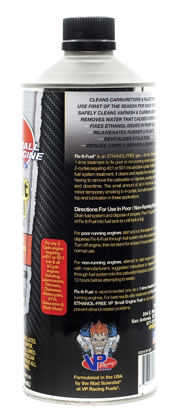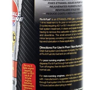 Fix-It-Fuel is designed as a single use treatment for poor or non-running small engines damaged by ethanol-blended street gas. It cleans and rejuvenates the fuel system to start more easily and operate in top condition. Fix-It-Fuel is a pre-mixed ETHANOL-FREE 89-octane gas plus oil blend. Although mixed with oil at 50:1, it works in any two- and four-cycle small engine application. Fortified with Mechanic in a Bottleâ¢, Fix-It-Fuel cleans and repairs the fuel system without having to remove the carburetor or injectors, avoiding costly repairs and downtime. It's best used as a pre-treatment before introducing ETHANOL-FREE VP small engine fuel which is designed for ongoing use to prevent ethanol-related problems from occurring in the first place.Item Specifications