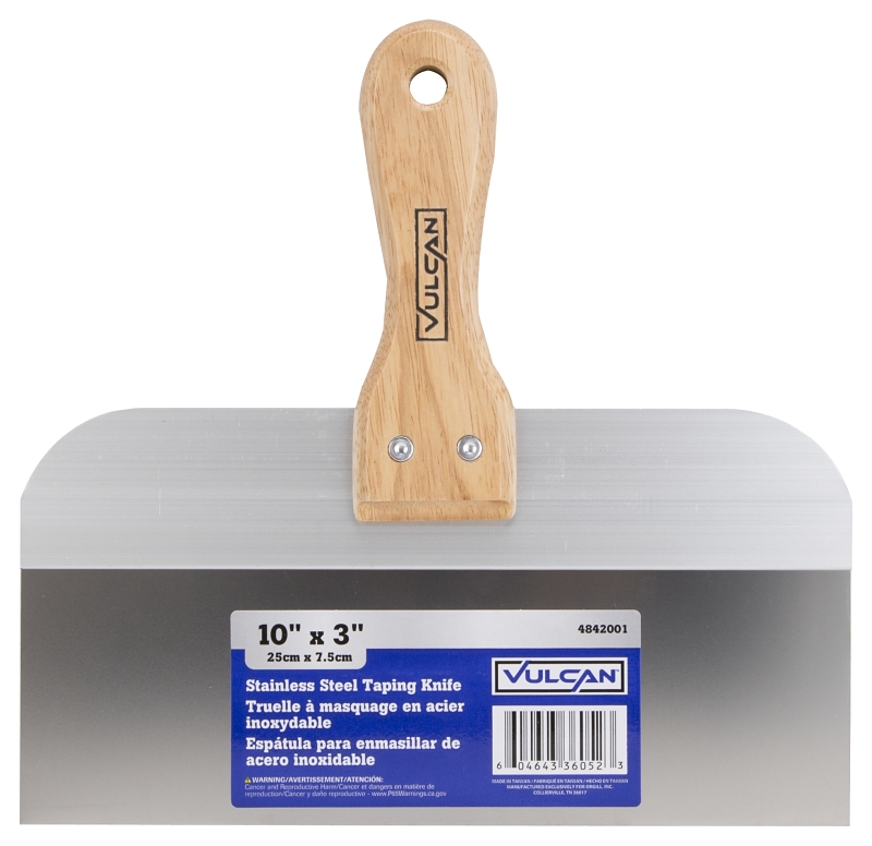 Home > Hand Tools > Tradesman Tools > Drywall and Plastering Tools > Drywall Taping Knives > Vulcan 36052 Knife, 3 in W Blade, 10 in L Blade, Stainless Steel Blade, Tapered Blade, Wood Handle, Wood Handle