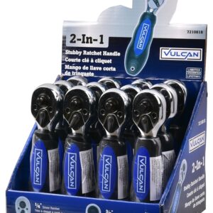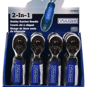 The Vulcan stubby ratchet has a 1/4 and 3/8 in drive size, dual head type and 72 geared teeth. Made of steel.