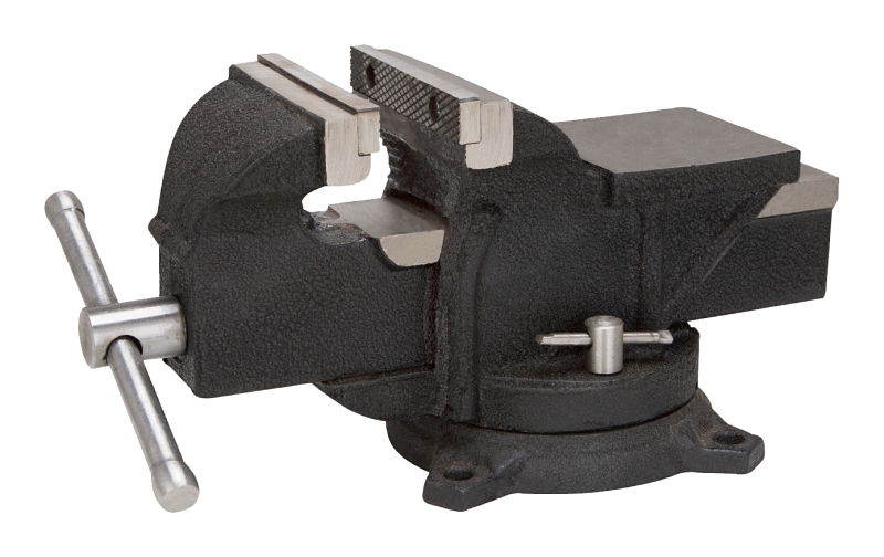 The Vulcan bench vise is typically used to hold a wood or metal work piece. It has 3 lock down bolts, serrated jaw with a jaw opening size of 5 in and a swivel base type. Made of cast iron steel.