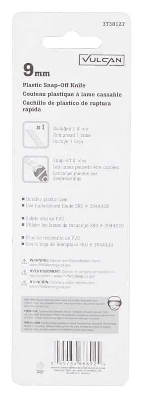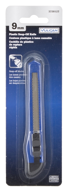 The Vulcan utility knife has a snap-off blade with a plastic handle. The blade is made of carbon steel and the blade dimensions are 3/8 in W. Includes a durable plastic case with a 9 mm replacement blade SKU# 3944428.