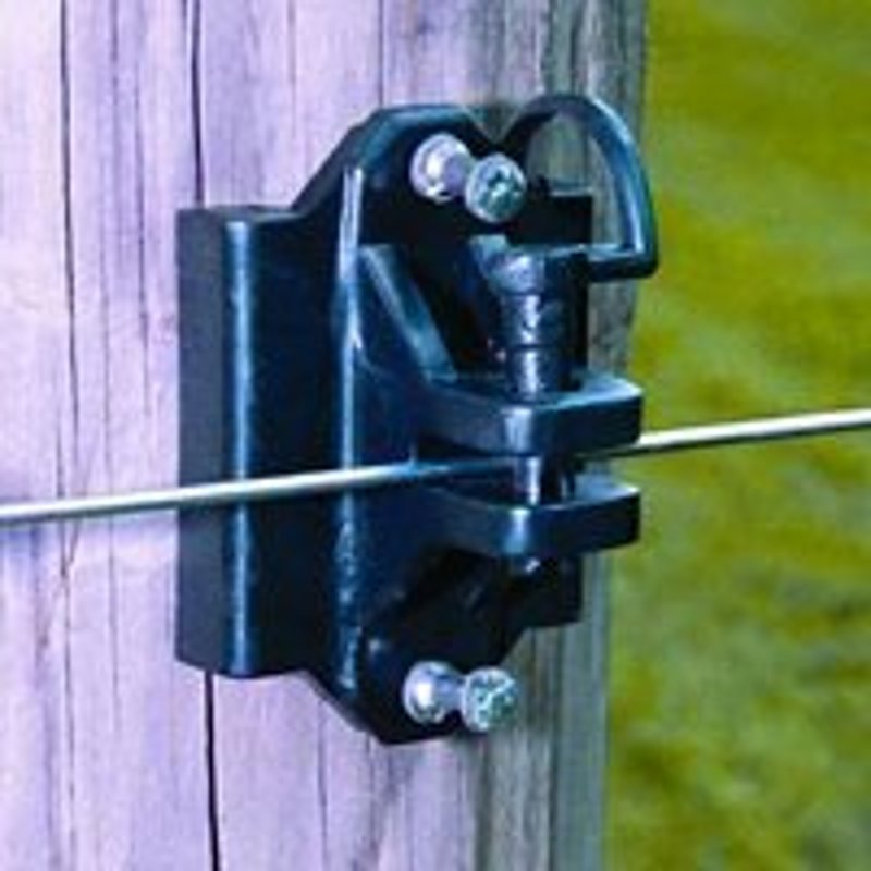 Our unique Zareba® wood post screw-in ring electric fence insulator fits the bill exactly. These insulators have an angled slot that ensures wire retention. They work with wire and polyrope.