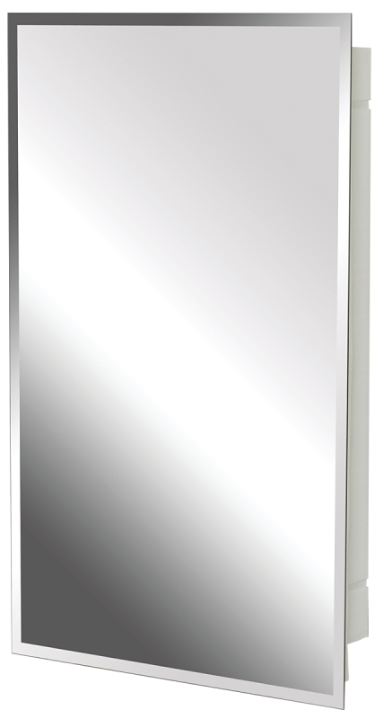Plastic body with 2 adjustable clear shelves, beveled mirror, right or left door opening, magnet closure mechanism. Assembled dimensions of 26 in H x 16 in W x 4-1/2 in D. Rough wall opening of 23 in H x 13 in W. Body dimensions of 25 in H x 15 in W x 4-1/4 in D. Recess depth of 3-1/2 in.Item Specifications