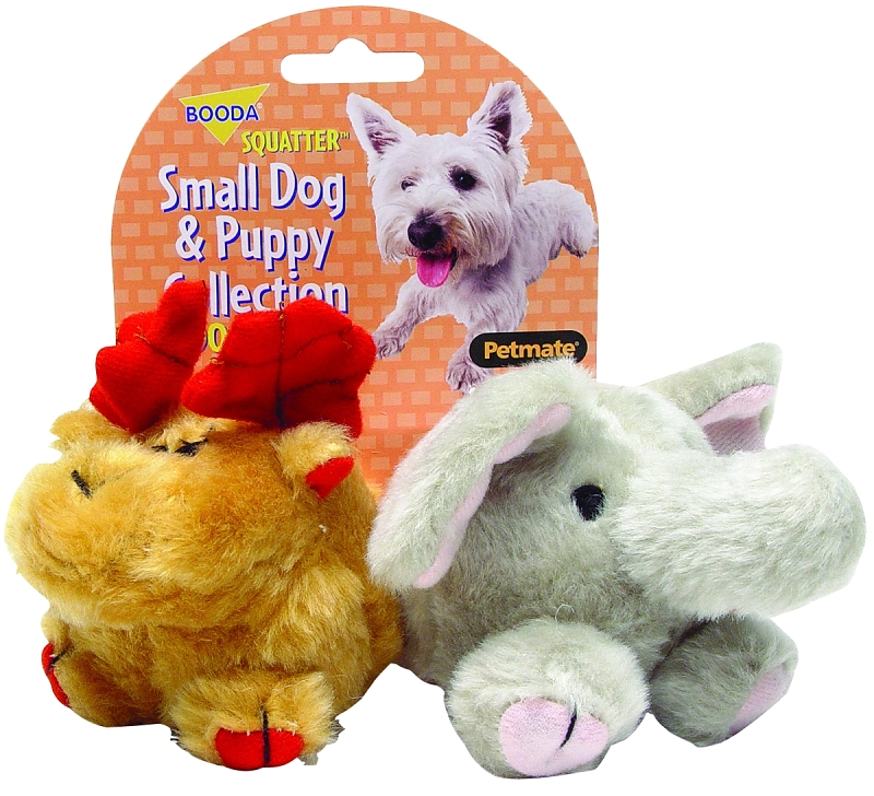 booda® small dog and puppy squatters® are adorable, pint-sized, ball-shaped plush toys with lots of personality. Soft for your dog to bite, yet durable and tough enough for a game of fetch. Drive your dog wild with these adorable characters, including moose, elephant, panda, rabbit, hedgehog or raccoon, featuring a fun squeaker. Sized ideally for small dogs and puppies.Item Specifications